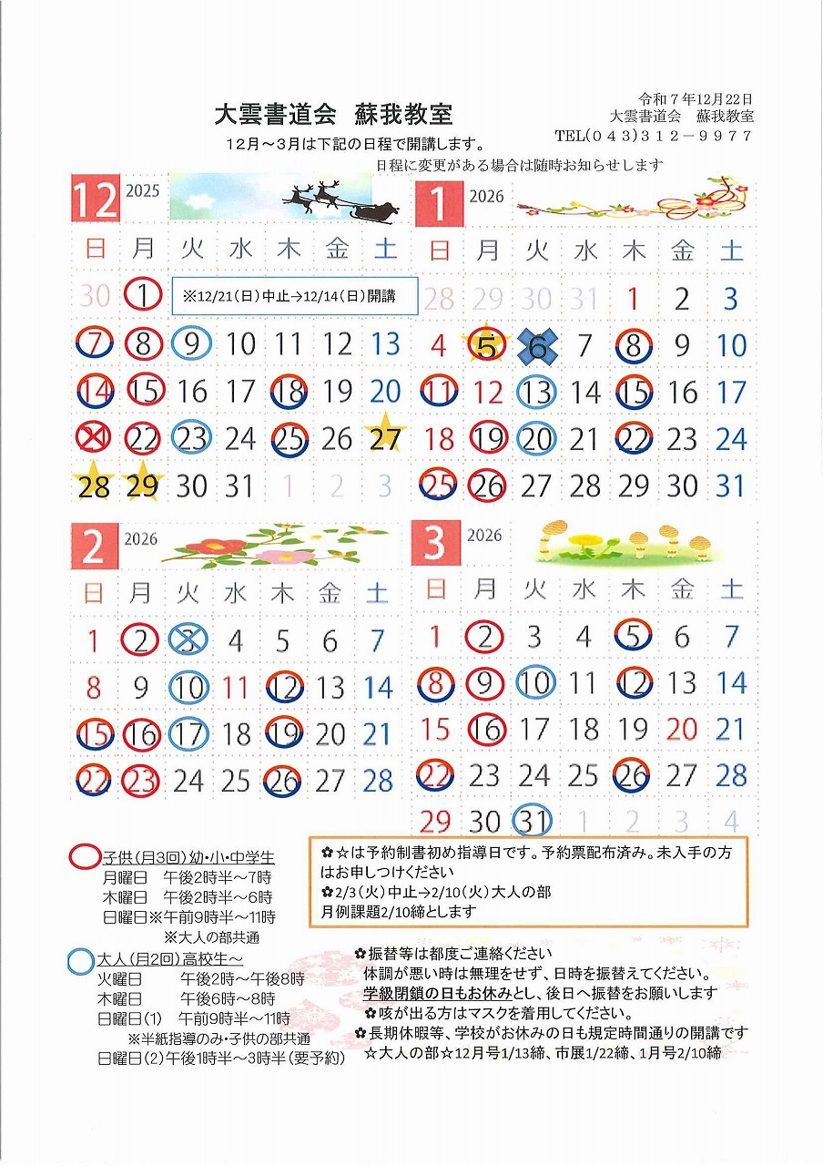 ★は子供の部・書初め(予約制)。12/27,28,29は通常指導はありません